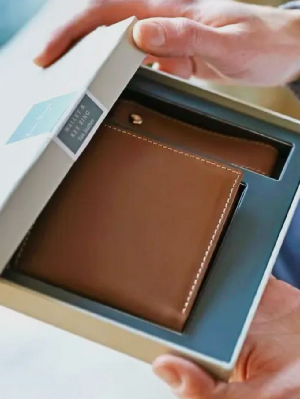 This men's gift set includes a stylish tan leather wallet and key ring.
